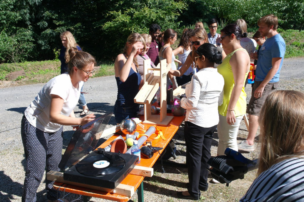 What followed was a bit of an experiment. We went outside to be active. The overall question was, if the whole retreat would be more fun if people would get to know each other better, if the idea of collaborating would become concrete and tangible. We therefore had a team event in form of a chain reaction. Similar to domino day, an initial impulse had to be propagated and amplified over some distance up to the final confetti canon. 35 PhD students and PostDocs were assigned by chance into 7 groups. Within these groups they built several stations to spread the impulse and then to transmit it to the next group. Diverse material could be used to build the chain reaction: balls, rockers and tunnels and the classic dominoes up to electric equipment such as hairdryers or record players. The building process started communication within the group and neighbouring groups. Participants described the chain reaction as a “great opportunity for students to get to know each other and break the ice” and appreciated the chance to do something practically before all the theory. In general, participants said they would appreciate a recurrence of a similar event and would recommend it for other SFBs and Transregios. It was great to see how doing something together “just for fun” could release a lot of positive energy. Everyone was involved in an activity where the overall effect is more than the sum of its individual parts. And that is what an SFB is all about in the end.