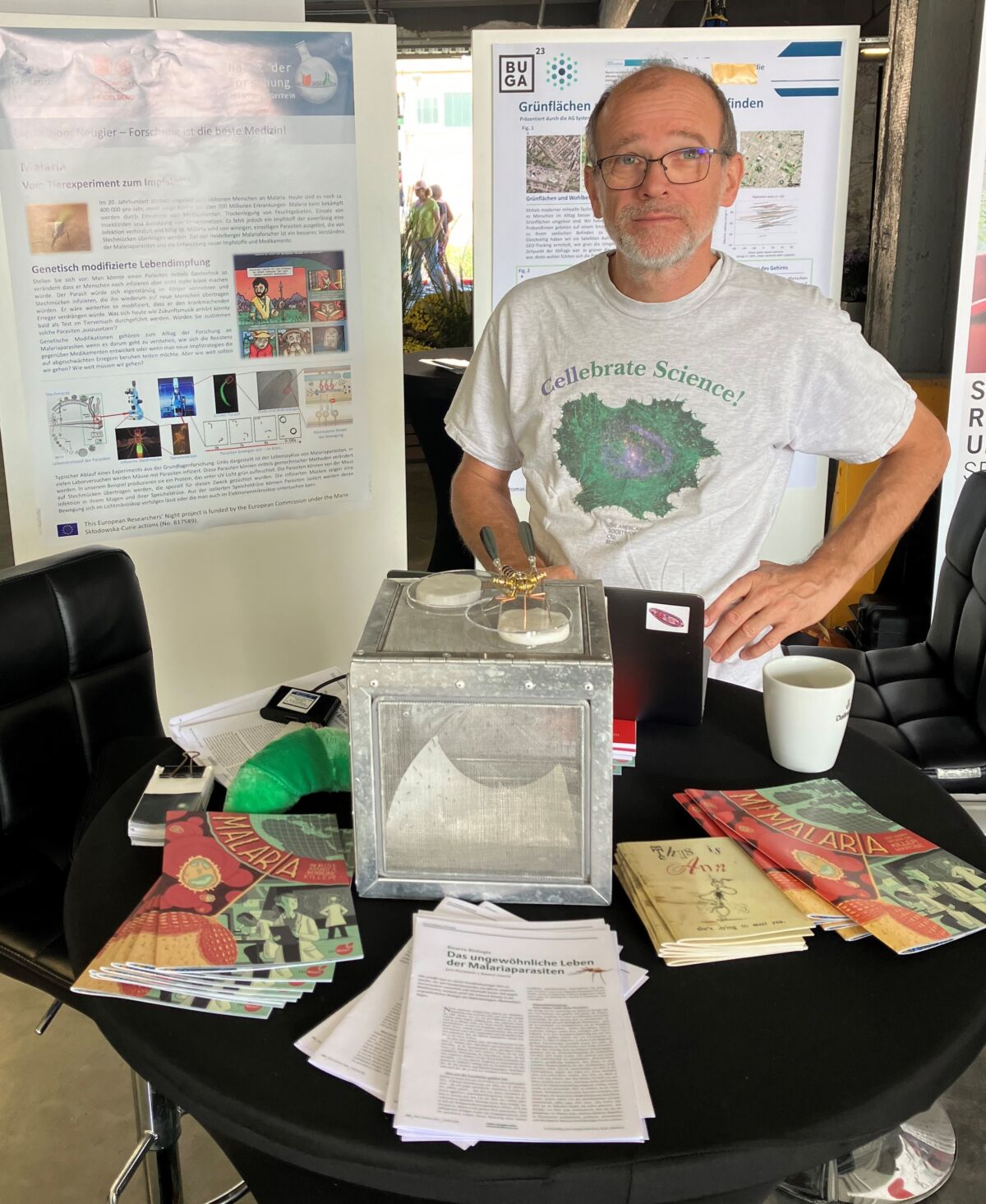 On October 1, two of our SFB group leaders, namely Freddy Frischknecht (project 1 and 22) and Markus Ganter (project 18), inspired the audience at the BUGA (Bundesgartenschau) in Mannheim with a talk on the question “Malaria in Mannheim – impossible?” They had an info booth on malaria with among other things literature (overview article, malaria comic, This is Ann) and some mosquitoes (safely kept in a cage) and they very much enjoyed sharing their knowledge with young and old.